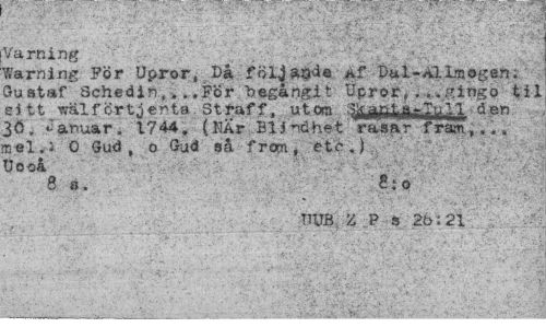 //// - 4 //// .(1 //// Varning //// Tarning Fr Upror, D flja0de Af Dal-A11mocen. Gustaf Sehedin,...Fr begngit tig //// sitt wllCrtjents Straff, utom ':-AAN,44441.:k..0 den 36. Januar. 1744. (NAr Blindhet rasNr //// rnel.: 0 Gud, o Gud 5 from, ett.) //// !TUB Z P s 2b;21 ////