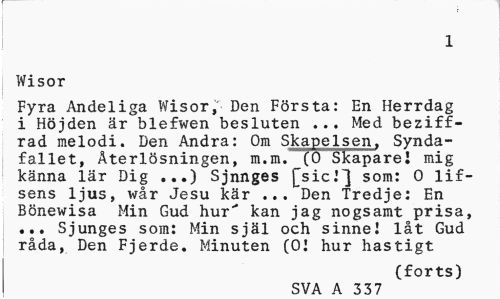 //// 1 //// Wisor //// Fyra Andeliga Wisor, Den Frsta: En Herrdag i Hjden r blefwen besluten ... Med beziffrad melodi. Den Andra: Om Skapelsen, Syndafallet, Aterlsningen, m.m. (0 Skapare: mig //// knna lr Dig ...) Sjunges [sic:3 som: 0 lifsens ljus, wr Jesu kr ... Den Tredje: En Bnewisa Min Gud hur' kan jag nogsamt prisa, ... Sjunges som: Min sjl och sinne: lt Gud rda, Den Fjerde. Minuten (0: hur hastigt //// (forts) //// SVA A 337 ////