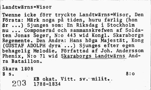 //// iLandtwrns=Wisor //// 1Twenne icke frr tryckte Landtwrns.Wisor, Den Frsta: Mrk noga p tiden, huru farlig (hon 4r ...) Sjunges som: En Riksdag i Stockholm //// u ... Componerad och sammanskrefwen af Soldaten Jonas Seger, N:o 443 wid Kongl. Skaraborgs IRegemente. Den Andra: Hans hga Majestt, Kong (GUSTAF ADOLPH dyra ...) Sjunges efter egen //// behagelig Melodie. Frfattad af Joh. Andersson Phenix, N:o 71 wid Skaraborgs Landtwrns Andra Bataillon. //// Skara 1808 //// 8 s. 8:o //// 203 KB okat. Vitt. sy.-milit., //// 204 1788-1834 ////