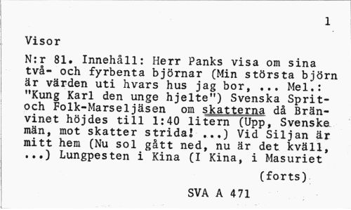 //// 1 //// Visor //// N:r 81. Innehll: Herr Panks visa om sina tv- och fyrbenta bjrnar (Min strsta bjrn r vrden uti hvars hus jag bor.. Mel.: "Kung Karl den unge hjelte") Svenska Sprit-och Folk-Marseljsen om skatterna d Brnvinet hjdes till 1:40 litern (Upp, Svenska mn, mot skatter strida: ...) Vid Siljan r mitt hem (Nu sol gtt ned, nu r det kvll, ...) Lungpesten i Kina (I Kina, i Masuriet //// (forts) //// SVA A 471 ////
