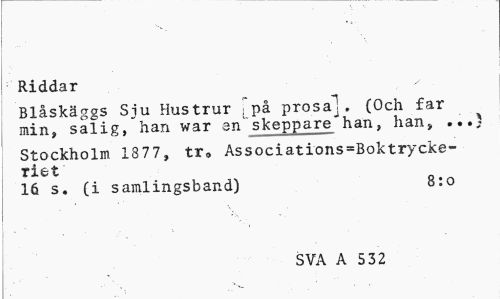 //// Riddar //// Blskggs Sju Hustrur jy prosaL (Och far min, salig, han war an skeppare han, han, ...) //// Stockholm 1877, tro Associations=Boktryckeriet //// 16 s. (i samlingsband) 8:o //// SVA A 532 ////