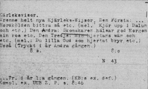 //// Krleksvisor. //// 'Trenne helt nya Kjrleks-Wijsor. .Len FOreta: NorOkUden bittra s etc. (mel.' KjCr upp i Dalur och etc.) Den Pirdra: Skoro: karer .hlsar god Morgon' nin ros etc. Den Tredt7TM/T"hjertans wr och etc. (mel.. Du lilla Gud som hjertat bryr et c.% Uoe (Tryckt i r Andra gngen) //// 8 a. //// N 43 //// ,..Tr. i r 1:a gngen. K3ze ex. defd :(4yelol. ex, Uln Z. P. e. e-.46 //// e ; o ////
