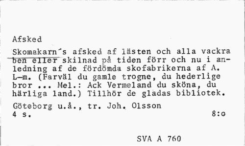 //// Afsked //// Skomakarn's afsked af lsten och alla vackra ben eiier skilnad p tiden frr och nu i anledning af de frdmda skofabrikerna af A. Lm. (Farvl du gamle trogne, du hederlige bror ... Mel.: Ack Vermeland du skna, du hrliga land.) Tillhr de gladas bibliotek. //// Gteborg u.., tr. Joh. Olsson //// 4 s. 8:o //// SVA A 760 ////