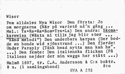 //// Wisor //// Fem alldeles Nya Wisor Den frsta: Jo //// om morgnarna (Nr p variet6 n'n gng ... Mel.: Ta=Ra=Ra=Bom=Tra=La) Den andra: Skornakarewisa (Wnta ni tills jag blir stor //// "Knd melodi") Den underbara harpan (Der bodde en bonde wid sjastrand ...) Den fjerde: Under Paraply (Tnk hwad nytta man kan ha'. ...) Den femte: Den italienska flickan (P Italiens nejder der min wagga har sttt ...) //// Malm 1897, tr. C.A. Andersson & C:s boktr. 8 s. (i samlingsband) 8:o //// SVA A 235 ////