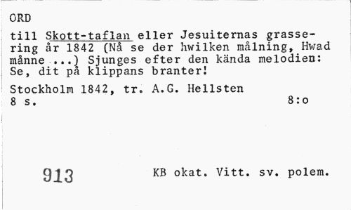 //// ORD //// till SIsg~ eller Jesuiternas grosse- //// ] ring r 1842 (Na se der hwilken mlning, Hwad mnne]...) Sjunges efter den knda melodien: Se, dit p klippans branter! //// Stockholm 1842, tr. A.G. Hellsten //// 8 s. 8:o //// 913 KB okat. Vitt. sv. polem. ////