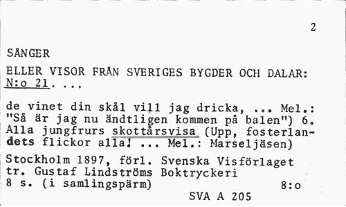 //// 2 //// SNGER //// ELLER VISOR FRN SVERIGES BYGDER OCH DALAR: //// N:o 21. ... //// de vinet din skl vill jag dricka, ... Mel.: "S r jag nu ndtligen kommen p balen") 6. 'Alla jungfrurs skottarsvisa (Upp, fosterlandets flickor alla! ... Mel.: Marseljsen) //// Stockholm 1897, frl. Svenska Visfrlaget tr. Gustaf Lindstrms Boktryckeri //// 8 s. (i samlingsprm) 8:0 //// SVA A 205 ////