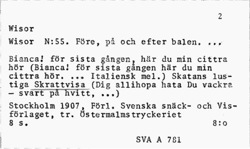 //// 2 //// Wisor //// Wisor N:SS. Fre, p och efter balen. //// Bianca: fr sista gngen, hr du min cittra hr (Bianca! fr sista gngen hr du min cittra hr. Italiensk mel.) Skatans lus- //// tiga Skrattvisa (Dig allihopa hata Du vackra svart p hvitt, ...) //// Stockholm 1907, Frl. Svenska snack- och Visfrlaget, tr. stermalmstryckeriet //// 8 s. 8:0 //// SVA A 781 ////