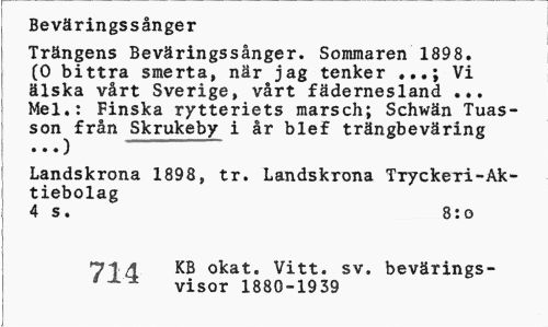 //// Bevringssnger //// Trngens Bevringssnger. Sommaren 1898. (0 bittra smerta, nr jag tenker ...; Vi lska vrt Sverige, vrt fdernesland ... //// Mel.: Finska rytteriets marsch; Schwn Tuas-son frn Skrukeby i r blef trngbevring ...) //// Landskrona 1898, tr. Landskrona Tryckeri-Aktiebolag 4 s. //// 714 KB okat. Vitt. sv. bevrings- //// visor 1880-1939 //// 8:0 ////