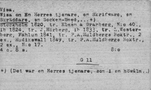 //// Visa. //// Wisa om En Herres tjenare, en Skrifwa e, en Skrddare. en Socken-Smed,+) //// stmErm 1820, tr. Elmisn Grarberg X"0 40., ib 1824, tr. J.HrberT, 1 1833, tr. L.Westerberg, Fahlun 1841, tr. ?.A.;iuldbergs Boktr., 2 ex., Hudikswall 1849, tr. P.n.Huldi-,erge Boktr., 2 ex., I'Lo 17. //// 4 c.8 a. //// 11 //// (Det war en Herres tjenare,-eom-i.en hwc lm < j //// 8:o ////