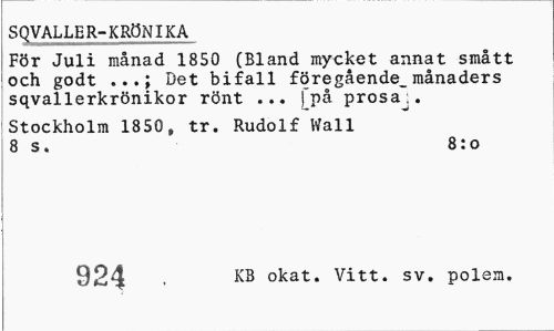 //// SqVALLER-KRNIKA //// Fr Juli mnad 1850 (Bland mycket annat smtt och godt ...; Det bifall fregende mnaders sqvallerkrnikor rnt ... )p prosa}. //// ,Stockholm 1850, tr. Rudolf Wall //// 8 s. 8:o //// 924 . KB okat. Vitt. sv. polera. ////