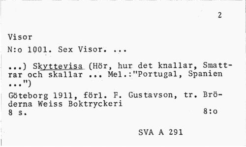 //// 2 //// Visor //// N:o 1001. Sex Visor. //// ...) Skvttevisa (Hr, hur det knallar, Smattrar och skallar ... Mel.:"Portugal, Spanien //// tI) //// Gteborg 1911, frt. F. Gustavson, tr. Brderna Weiss Boktryckeri //// 8 s. 8:o //// SVA A 291 ////