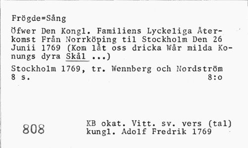 //// Frgde=Sng //// fwer Den Kongl. Familiens Lyckeliga terkomst Frn Norrkving til Stockholm Den 26 Junii 1769 (Kom lat oss dricka Wr milda Konungs dyra Skl ...) //// Stockholm 1769, tr. Wennberg och Nordstrm //// 8 s. 8:o //// KB okat. Vitt. sv. vers (tal) 808 kungl. Adolf Fredrik 1769 ////