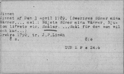 //// ".Irrtet //// Unnet Af Den 3 1789. (Sweriges Sner mina //// Vnner,... mei,: Nj ete Sner mir a Wrrer, Njuat lifwete etc. Sklar. ...Sk-l fr den som wil h kar...) //// rearo 1790, tr. J P.Lndh 8 s, //// c. P 5 24 ; //// 8;o ////