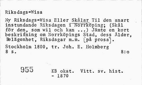 //// Riksdags=Wisa //// Ny Riksdags=Wisa Eller Sklar Til den snart instundande Riksdagen 1715iffkping; (Skl fr den, som wil och kan ...) Jmte en kort beskrifning om Norrkpings Stad, dess lder, Belgenhet, Riksdagar m.m. Cp prosa]. //// Stockholm 1800, tr. Joh. E. Holmberg 8 s. //// 955 KB okat. Vitt. sv. hist. //// - 1870 //// 8;o ////