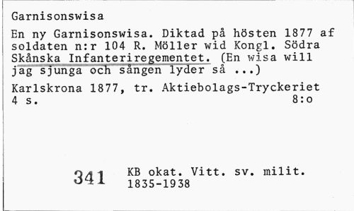 //// Garnisonswisa //// En ny Garnisonswisa. Diktad p hsten 1877 af soldaten n:r 104 R. Mller wid Kongl. Sdra Sknska Infanteriregementet. (En wisa will //// j ag s 6-Eligliigenfiler s ... ) //// Karlskrona 1877, tr. Aktiebolags-Tryckeriet 4 s. 8:o //// 34 1 KB okat. Vitt. sv. milit. //// 1835-1938 ////