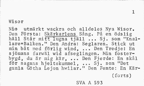 //// 1 //// Wisor //// Nio utmrkt wackra och alldeles Nya Wisor. Den Frsta: Skrkarlens Sng. P en dslig hll Str mitt lugna tjll ... Sj. som "Knallare=Balken." Den Andra: Seglaren. Stick ut min bt med frlig wind, ... Den Tredje: En sjmans farwl wid afseglingen. Min fosterbygd, du r mig kr, Den Fjerde: En skl //// fr sagans hjeltekummel, ... Sj. som "Det gamla Gtha Lejon hwilar." Den Femte: En Kr- //// (forts) //// SVA A 593 ////