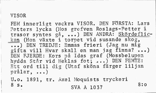 //// VISOR //// FEM innerligt vackra VISOR. DEN FRSTA: Lars Petters lycka (Hos grefven Roslags-Petter trasor syntes g, ...) DEN ANDRA: Skrdeflickan (Hon vxte i torpet vid susande skog, ...) DEN TREDJE: Emmas frieri (Jag nu mig gifta vill Hvar skall en man jag finna? ...) DEN FJERDE: Kors p Idas graf (Mossbelupen hydda Str vid Heklas fot; ,...) DEN FEMTE: Ett ord till dig (Utaf skna frger liljan prlar, ...) //// U.o. 1891, tr. Axel Moquists tryckeri //// 8 s. 8:0 //// SVA A 1037 ////