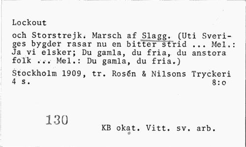 //// Lockout //// och Storstrejk. Marsch af Slagg. (Uti Sveri ges bygder rasar nu en bitU7-3f-rid Mel.: //// Ja vi elsker; Du gamla, du fria, du anstora folk ... Mel.: Du gamla, du fria.) //// Stockholm 1909, tr. Rosn & Nilsons Tryckeri 4 s. 8:o //// 1 :3 0 KB okat. Vitt. sv. arb. ////
