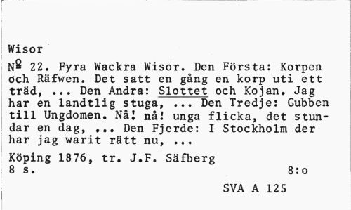 //// Wisor //// 14 22. Fyra Wackra Wisor. Den Frsta: Korpen och Rfwen. Det satt en gng en korp uti ett trd, ... Den Andra: Slottet och Kojan. Jag har en landtlig stuga, ... Den Tredje: Gubben till Ungdomen. N: n! unga flicka, det stundar en dag, ... Den Fjerde: I Stockholm der har jag warit rtt nu, ... //// Kping 1876, tr. J.F. Sfberg 8 s. //// 8:o //// SVA A 125 ////