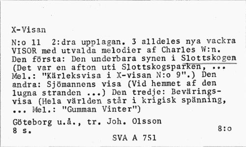 //// X-Visan //// N:o 11 2:dra upplagan. 3 alldeles nya vackra VISOR med utvalda melodier af Charles W:n. Den frsta: Den underbara synen i Slottskogen (Det var en afton uti Slottskogspatnn, 77: Mel.: "Krleksvisa i X-visan N:o 9".) Den andra: Sjmannens visa (Vid hemmet af den lugna stranden ...) Den tredje: Bevringsvisa (Hela vrlden str i krigisk spnning, //// Mel.: "Gumman Vinter") //// Gteborg u.., tr. Joh. Olsson //// 8 s. 8:o //// SVA A 751 ////