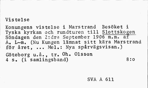 //// Vistelse //// Konungens vistelse i Marstrand Besket i Tyska kyrkan och rundturen till Slottskogen Sndagen den 2:dre September 1906 m.m. af //// A. L--m. (Nu Kungen lmnat sitt kra Marstrand fr ret, ... Mel.: Nya sprvgsvisan.) //// Gteborg u.., tr. Oh. Olsson //// 4 s. (i samlingsband) 8:0 //// SVA A 611 ////