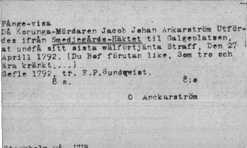 //// Fånpe-visa //// Da Korunga-Mördaren Jacob Jshan Ankarström Utför-des ifrån Sm^djegårds-Käktet til Galgeplat»en, at undfå s It"t a i s t a^waif örTj än ta Straff, Ben 27 Aprill 1792. (Du B®f förutan like. Som tro och ära kränkt,,.,.) //// Gefle 1792. ti*. E.P-.SUr»di|wi»t. //// 8 i». 8; • //// 0 Anckarstrora ////