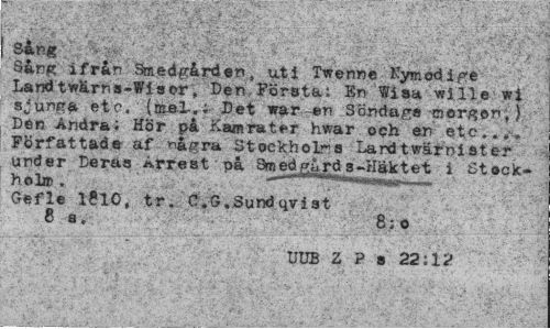 //// S&rg ifrån Smed-gården, uti Twenne Kymodige Landtwärns-Wisor; Den Första: Bn Wisa vrille wi sjunga etc, (mel-.; Det *ar -en Söndagsmorgon,) Den Andra; Hör på Karerat*»r hwar oqh en etc..,. Författade af ^igra Stockholms Land tvärni stör under Deras Arrest pä Smed^rd a -Häktet i Stack-hol» . 1 l''.»"««ui . - //// Gefle 1810, tr. C.G.Sundqyist //// 8a, 8;o //// UUB Z P 8 22:12 ////