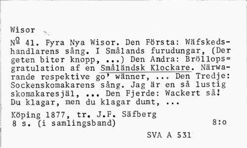 //// V/is or ^ //// N§ 41. Fyra Nya Wisor. Den Första: Wäfskeds-handlarens sång. I Smålands furudungar, (Der geten biter knopp, ...) Den Andra: Bröllops= gratulation af en Småländsk Klockare. Närwa-rande respektive go' wänner, ... Den Tredje: Sockenskomakarens sång. Jag är en så lustig skomakaresjäl, ... Den Fjerde: Wackert såJ Du klagar, men du klagar dumt, ... //// Köping 1877, tr. J.F. Säfberg 8 s. (i samlingsband) 8:o //// SVA A 5 31 ////