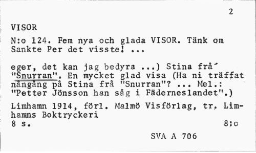 //// 2 //// VISOR //// N:o 124. Fem nya och glada VISOR. Tänk om Sankte Per det visste] ... //// eger, det kan jag bedyra ...) Stina frå"* "Snurran". En mycket glad visa (Ha ni träffat nångäng på Stina frå "Snurran"? ... Mel.: "Petter Jönsson han såg i Fäderneslandet".) //// Limhamn 1914, förl. Malmö Visförlag, tr, Limhamns Boktryckeri //// 8 s. 8: c //// SVA A 706 ////