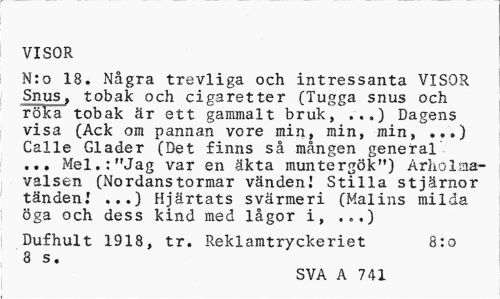 //// VISOR //// N:o 18. Några trevliga och intressanta VISOR SnuSj tobak och cigaretter (Tugga snus och röKa tobak är ett gammalt bruk, ...) Dagens visa (Ack om pannan vore min, min, min, ...) Calle Gläder (Det finns så mången general ... Mel.:"Jag var en äkta muntergök") Arholma-valsen (Nordanstormar vändenJ Stilla stjärnor tänden.' ...) Hjärtats svärmeri (Malins milda öga och dess kind med lågor i, .„,) //// Dufhult 1918, tr. Reklamtryckeriet 8:0 //// 8 s //// SVA A 741 ////