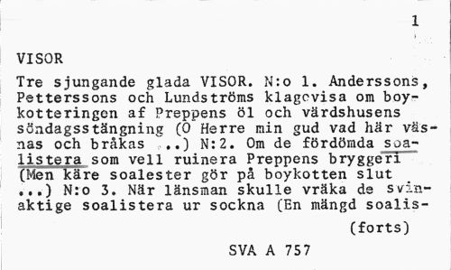 //// 757 //// VISOR //// Tre sjungande glada VISOR. N:o 1. Anderssons, Petterssons och Lundströms klagcvisa om boy-kotteringen af Preppens öl och värdshusens söndagsstängning (O Herre min gud vad här väsnas och bråkas *..) N:2. Om de fördömda soa-listera som vell ruinera Preppens bryggeri (Men käre soalester gör på boykotten slut ..,) N:o 3. När länsman skulle vräka de svin-aktige soalistera ur sockna (En mängd soalis- //// (forts) //// SVA A 710 ////