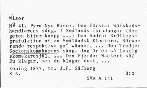 //// Wisor //// N- 41. Fyra Nya Wisor. Den Första: Wäfskeds-handlarens sång. I Smålands furudungar (der geten biter knopp ...) Den Andra: Bröllops= gratulation af en Småländsk Klockare. Närwa-rande respektive go' wänner, ... Den Tredje: Sockenskomakarens sång. Jag är en så lustig skomakaresjäl, ... Den Fjerde: Wackert såj Du klagar, men du klagar dumt, ... //// Köping 1877, tr. J.F. Säfberg 8 s. 8:o //// SVA A 141 ////