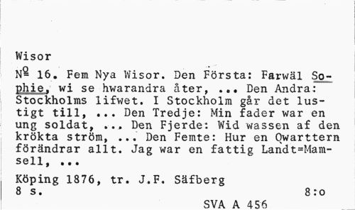 //// Wisor //// N^ 16. Fem Nya Wisor. Den Första: Farwäl So-phie. wi se hwarandra åter, ... Den Andra: Stockholms lifwet. I Stockholm går det lustigt till, ... Den Tredje: Min fader war en ung soldat, ... Den Fjerde: Wid wassen af den krökta ström, ... Den Femte: Hur en Owarttern förändrar allt. Jag war en fattig Landt=Mam-sell, ... //// Köping 1876, tr. J.F. Säfberg 8 s. 8:o //// SVA A 456 ////