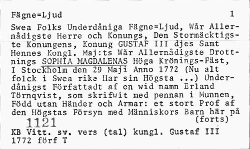 //// Fägne=Ljud 1 //// Swea Folks Underdåniga Fägne=Ljud, Wår Aller-nådigste Herre och Konungs, Den Stormäcktigs-te Konungens, Konung GUSTAF III djes Samt Hennes Kongl. Maj:ts Wår Allernådigste Drottnings SOPHIA MAGDALENAS Höga Krönings-Fäst, I Stockholm den 29 Maj i Anno 1772 (Nu alt folck i Sv/ea rike Har sin Högsta ...) Under-dånigst Författadt af en wid namn Erland Törnqvist, som skrifwit med pennan i Munnen, Född utan Händer och Armar: et stort Prof af den Högstas Försyn med Människors Barn här nå //// 1121 Cforts^ KB Vitt. sv. vers (tal) kungl. Gustaf III 1772 förf T ////