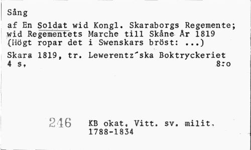 //// Sång //// af En Soldat wid Kongl. Skaraborgs Regemente; wid Regementets Marche till Skåne År 1819 (Högt ropar det i Swenskars bröst: ...) //// Skara 1819, tr. Lewerentz"ska Boktryckeriet 4 s, 8-ro //// 246 KB okat. Vitt. sv. milit, 1788-1834 ////