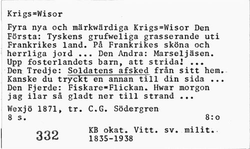 //// Krigs=Wisor //// Fyra nya och märkwärdiga Krigs=Wisor Den Första: Tyskens grufweliga grasserande uti Frankrikes land. På Frankrikes sköna och herrliga joid ... Den Andra: Marseljäsen. Upp fosterlandets barn, att strida! ... Den Tredje: Soldatens afsked från sitt hem. Kanske du tryckt en annan till din sida ... Den Fjerde; Fiskare«Flickan. Hwar morgon jag ilar så gladt ner till strand ... //// Wexjö 1871, tr. C.G. Södergren 8 s. 8:0 //// 000 KB okat. Vitt. sv. milit. //// 066 1835-1938 ////