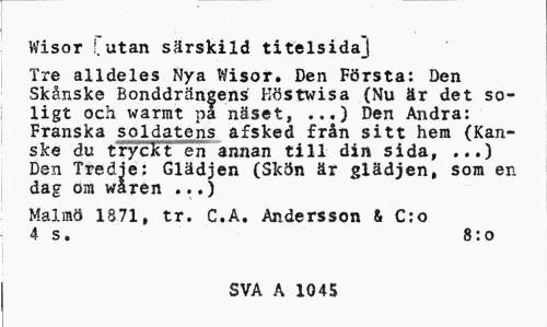 //// Wisor !. utan särskild titelsidaj //// Tre alldeles Nya Wisor. Den Första: Den Skånske Bonddrängens Höstwisa (Nu är det soligt och warrat pa näset, ...) Den Andra: Franska soldatens afsked från sitt hem (Kanske du tryckt en annan till din sida, ...) Den Tredie: Glädjen (Skön är glädjen, som en dag om waren ...) //// Malmö 1871, tr. C.A. Andersson & C:o //// 4 s. 8:0 //// SVA A 1045 ////