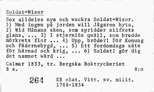 //// Soldat=Wisor //// Sex alldeles nya och wackra Soldat=Wisor. //// 1) Med ingen på jorden will Jägaren byta, //// 2) Wid Månans sken, som spridder silfrets glans, ... 3) I stjernlös qwäll, som bredde mörkrets flor ... 4) Upp, broderi För Konung och Fädernebygd, ... 5) Ett fordomdags säte för härnad och krig, ... 6) Soldat.' gör dig det namnet wärd ... //// Calmar 1833, tr. Bergska Boktryckeriet 8 s. 8: o //// 264 KB okat» Vitt. sv. milit. //// 1788-1834 ////
