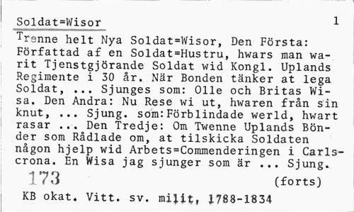 //// Soldat=Wisor 1 //// Trenne helt Nya Soldat=Wisor, Den Första: Författad af en Soldat=Hustru, hwars man wa-rit Tjenstgjörande Soldat wid Kongl. Uplands Regimente i 30 år. När Bonden tänker at lega Soldat, ... Sjunges som: Olle och Britas Wisa. Den Andra: Nu Rese wi ut, hwaren från sin knut, ... Sjung, som:Förblindade werld, hwart rasar ... Den Tredje: Om Twenne Uplands Bönder som Rådlade om, at tilskicka Soldaten någon hjelp wid Arbets=Commenderingen i Carls-crona. En Wisa jag sjunger som är ... Sjung. //// | 173 (forts) //// KB okat. Vitt. sv. milit, 1788-1834 ////