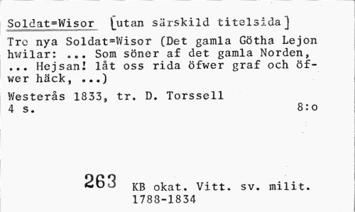 //// Soldat=Wisor hatan särskild titelsida] //// Tre nya Soldat-Wisor (Det gamla Götha Lejon hvrilar: ... Som söner af det gamla Norden, ... Hejsan.' låt oss rida öfwer graf och öf-wer häck, ...) //// Westerås 1833, tr. D. Torssell 4 s. 8:0 //// 263 KB okat. Vitt. sv. milit. //// 1788-1834 ////