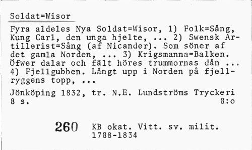 //// Soldat=Wisor //// Fyra aldeles Nya Soldat=Wisor, 1) Folk=Sång, Kung Carl, den unga hjelte, ... 2) Swensk Ar-tillerist=Sång (a£ Nicander). Som söner af det gamla Norden, ... 3) Krigsmanna=Balken. Öfwer dalar och fält höres trummornas dån .,, 4) Fjellgubben. Långt upp i Norden på fjell-ryggens topp, ... //// Jönköping 1832, tr. N.E. Lundströms Tryckeri 8 s. 8:o //// 260 KB okat» Vitt. sv. milit. //// 1788-1834 ////