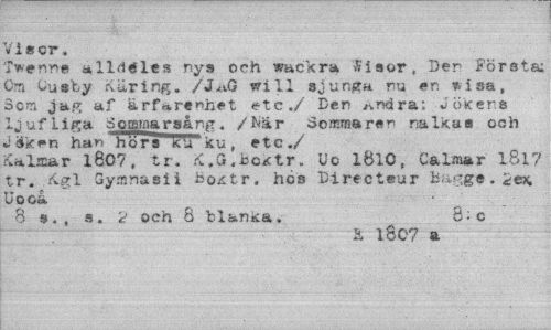//// Viser, //// Twenne a,lld<sles nys och wackra Siaor, Der Första; Om ^usby Käring. /J.aG will sjung* nu en *isa, 3cm ja pt af Erfarenhet etc./ Den /-.ndra; Jöfcen.s Ijufliga sommarsår.fr. /När Sommaren nalkas och Jisken hors Kli" ku, etc./ //// Saloar l807, tr. ,<.G.-bo/ctr. Uo 1810, Calmar 1817 tr. rCgl Gymnasii feo^tr. hos D-irecteur bagge. 2ex, Uocå //// 8 s., s. 2 och 8 blanka. 8;c //// K l8C7 a ////