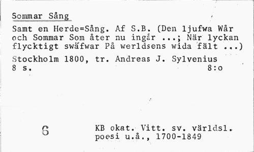//// Sommar Sång //// Samt en Herde=Sång. Af S.B. (Den ljufwa Wår och Sommar Som åter nu ingår När lyckan //// flycktigt swä'fwar På werldsens wida fält .,.) //// Stockholm 1800, tr. Andreas J. Sylvenius 8 s. 8:0 //// q KB okat. Vitt. sv. världsl, //// 0 poesi u.å., 1700-1849 ////