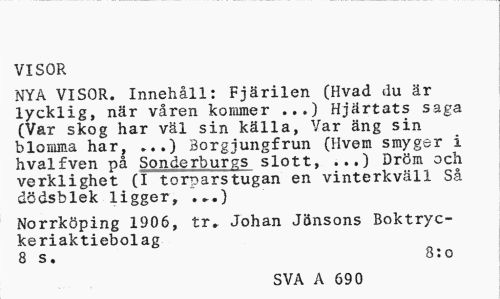 //// VISOR //// NYA VISOR. Innehåll: Fjärilen (Hvad du är lycklig, när våren kommer ...) Hjärtats saga (Var skog har väl sin källa, Var äng sin blomma har, »..) Borgjungfrun (Hvem smyger i hvalfven på Sonderburgs slott, ...) Dröm och verklighet (I torparstugan en vinterkväll Så dödsblek ligger, .„.) //// Norrköping 1906, tr» Johan Jönsons Boktryckeriaktiebolag //// 8 s. 8:0 //// SVA A 690 ////