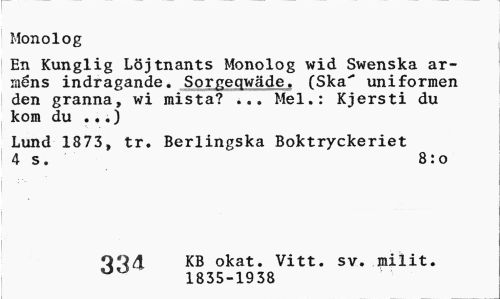 //// Monolog //// En Kunglig Löjtnants Monolog wid Swenska arméns indragande. Sorpeqwäde. (Ska" uniformen den granna, wi mista? ... Mel.: Kjersti du kom du ...) //// Lund 1873, tr. Berlingska Boktryckeriet 4 s. 8:0 //// KB okat. Vitt. sv. milit. //// 1835-1938 ////