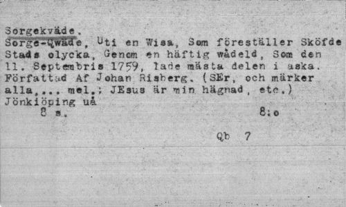 //// 3orgekväde. //// Sorge-^wade, Uti en Wisa, Som föreställer Sköfde Stads olycka, Géncm en häftig wadeld, Som den 11. Septemhris 1759, lade masta delen i aska. Författad Af Johan Risberg. (SEr, och märker alla,... mel.; JKsus är min hägnad, etc.) Jönkiöping uå //// 8 s. 8; o //// Qb 7 ////