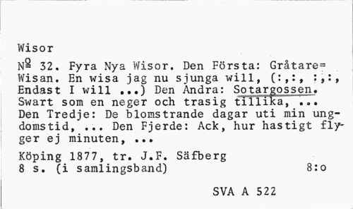 //// Wisor //// N§ 32. Fyra Nya Wisor. Den Första: Gråtare= Wisan. En wisa jag nu sjunga will, (:,:, Endast I will ...) Den Andra: Sotargossen. Swart som en neger och trasig tillika, ... Den Tredje: De blomstrande dagar uti min ungdomstid, ... Den Fjerde: Ack, hur hastigt flyger ej minuten, ... //// Köping 1877 , tr. J.F. Säfberg 8 s. (i samlingsband) 8:o //// SVA A 522 ////
