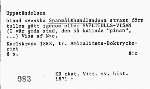 //// Uppståndelsen //// bland svenska Snanmålshandlandena straxt före tullen gått igenorTeiler SVÄLTTULLS-VISAN (I vår goda stad, den så kallade "pinan", ?..) Visa af N-e. //// Karlskrona 1888, tr. Amitalitets-Boktrycke-riet //// 8 s. 8:0 //// KB okat. Vitt. sv. hist. 983 i87i - ////