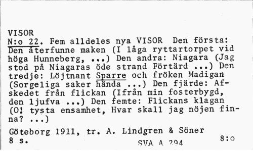 //// VISOR //// N:o 22. Fem alldeles nya VISOR Den första: Den återfunne maken (I låga ryttartorpet vid höga Hunneberg, ...) Den andra: Niagara (Jag stod på Niagaras öde strand Förtärd ...) Den tredje: Löjtnant Sparre och fröken Madigan (Sorgeliga saker hända ...) Den fjärde: Af-skedet från flickan (Ifrån min fosterbygd, den ljufva ...) Den femte: Flickans klagan (0] tysta ensamhet, Hvar skall jag nöjen finna? ...) //// Göteborg 1911, tr. A. Lindgren & Söner //// 8 s» SVA A ?Q4 8:0 ////