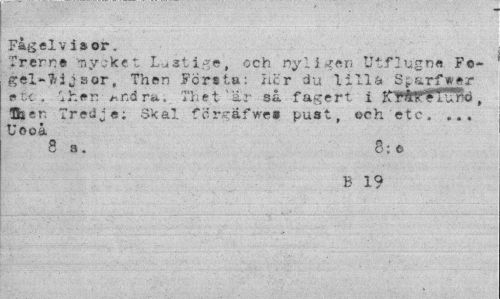 //// Fågel v i» or. //// frerne -ny.-ket Lustige, och nyligen Utflugne Fo-gel-7/ijaor, Then Fcrsta: iu:'r du lilla Sparfwer etc, i hen ra.. The t- 'är så fagert i ItfåHl^PCTd 5i t 7redj e; Skal fcrgäfwes pust, och etc. ... Uooå //// Sa. 8:0 //// B 19 ////